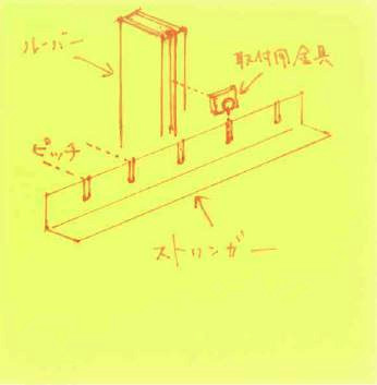 ルーバーは数も多くなりがち、職人さんの調整できれいに並べていくのはとても大変な作業になってきますので、サポート部材がとても便利で役に立つんです。それが金物業界の「ストリンガー」英【stringer】。